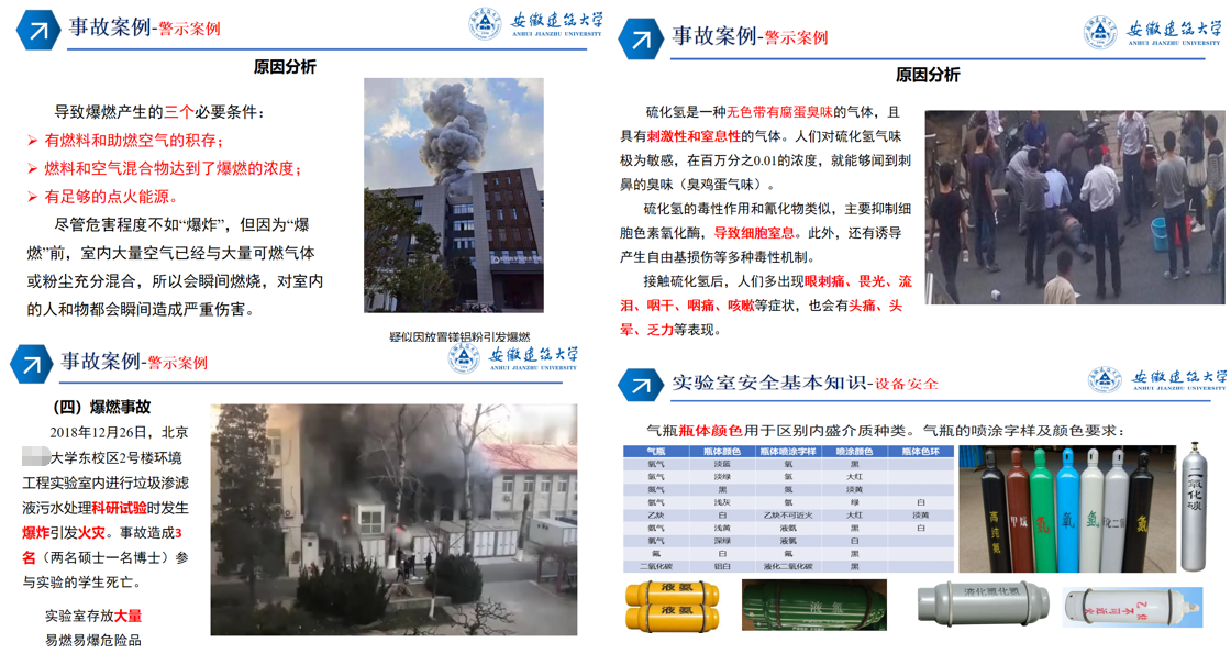 课程首先以“安全无小事 责任重于山”为主题,结合安全事故警示案例,通过图片、视频及公开的调查报告等教学素材,直观呈现了违规操作引发的火灾、爆炸、化学品泄漏等实验室安全事故,深刻剖析了事故背后的安全管理漏洞和人为失误,使学生深刻领会到“实验室安全无小事”,任何不规范操作都可能导致严重后果。第二阶段,课程围绕化学品安全、消防安全、水电安全、气体使用安全、实验废物处理、实验室准入要求、个体防护、应急处置常识等,深入浅出地讲授了实验室安全基础知识,在提高学生实验室安全意识的同时,进一步增强个人防护能力。