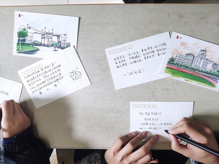 本网讯 12月24日,土木学院土木工程学生第一党支部举办明信片送祝福活动,在硕士研究生考试进入倒计时之际,用温暖助力考研学子求学路。 在支部书记王月竹的带领下,支部学生党员自发组织,精心编排设计、撰写了对2021届考研学子的祝福明信片,并利用学生吃饭时间“偷偷”放在复习资料上,为考研学子默默助力!他们轻轻落步,凭借小小的“暖心”明信片,为考研学子送上最真挚的祝福与慰藉。希望今天的你,是坚强、努力拼搏的你,明天的你,是幸福、光辉荣耀的你! 星光不问赶路人,时光不负有心人。支部党员共同祝愿考研学子考试顺利,金榜题名,都能取得自己心中理想的成绩。(文/图:王月竹 蒋豪杰 杨俊杰;审核:胡燕青) |