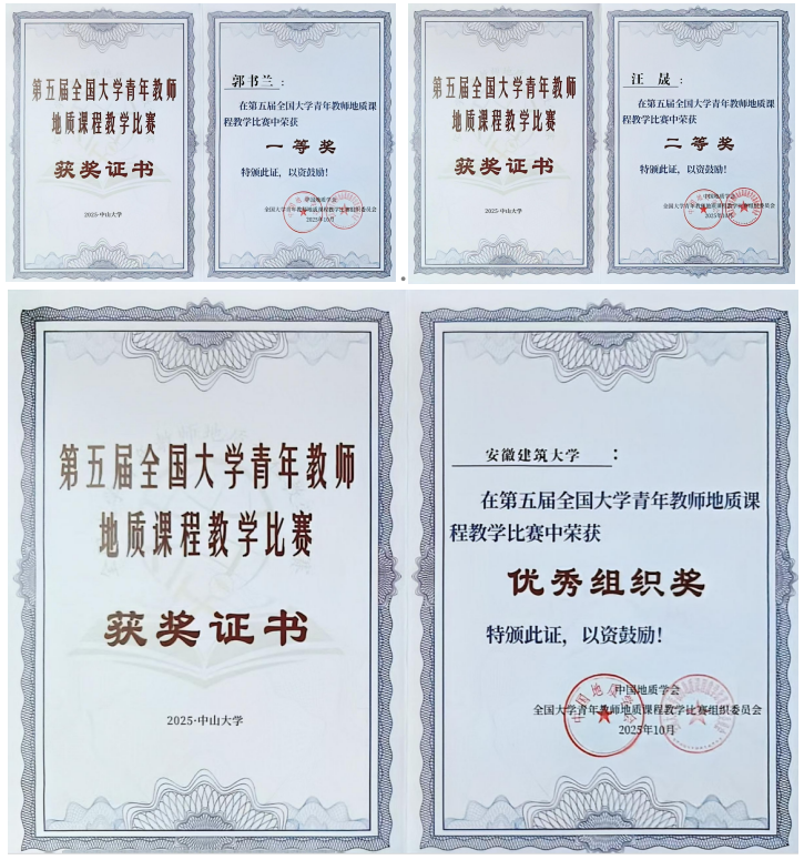 此次获奖是学院地质学科教学改革成果的集中体现,更是对全体教师深耕教学一线的肯定与激励。未来,学院将继续以学科建设为龙头,以教学创新为动力,进一步加强青年教师队伍培养,深化课程思政建设,推动土木工程学科课程教学质量再上新台阶,为培养更多适应新时代需求的高素质土建类人才贡献力量。(文/图:郭书兰、汪晟;一审:刘洋;二审:施国栋;三审:王媛)