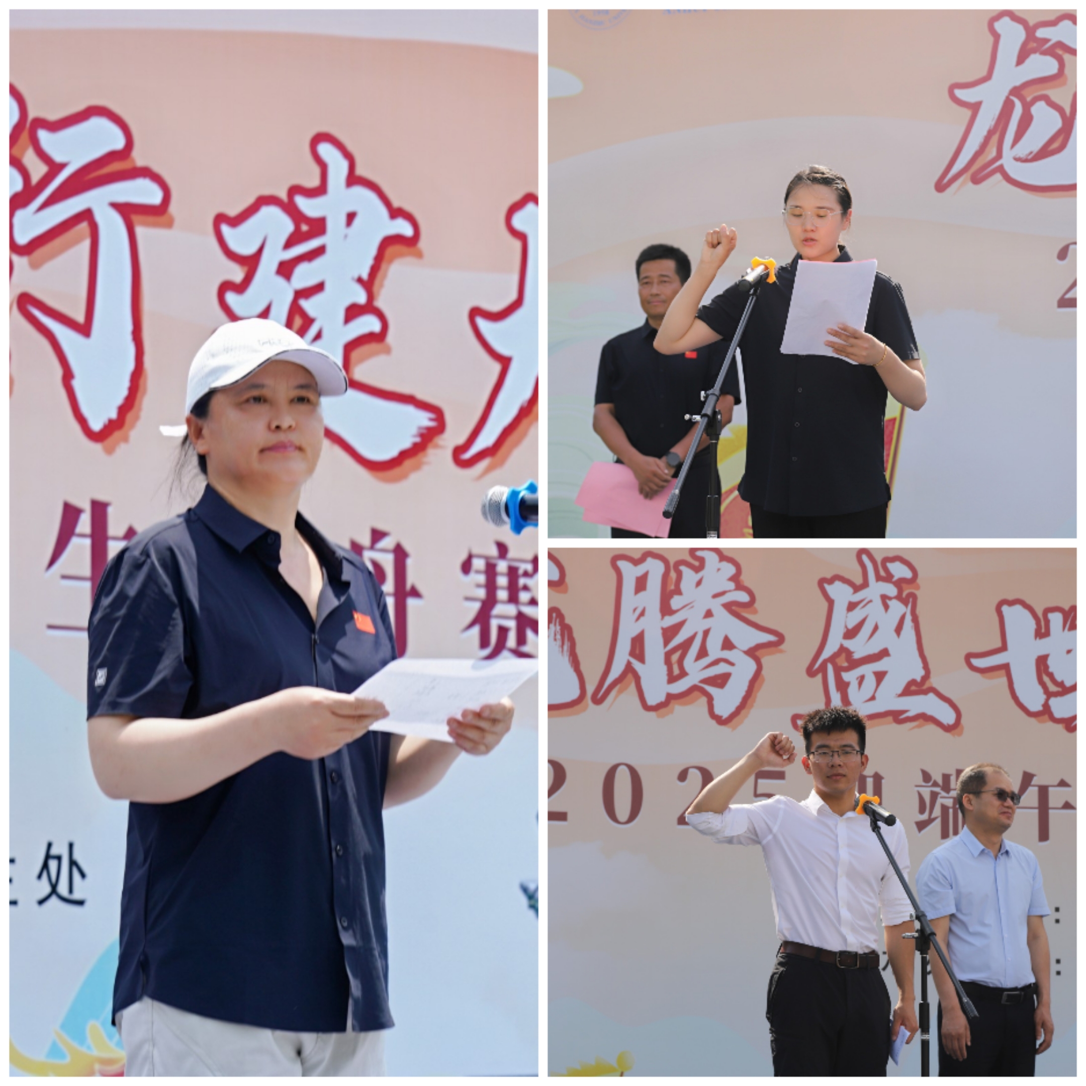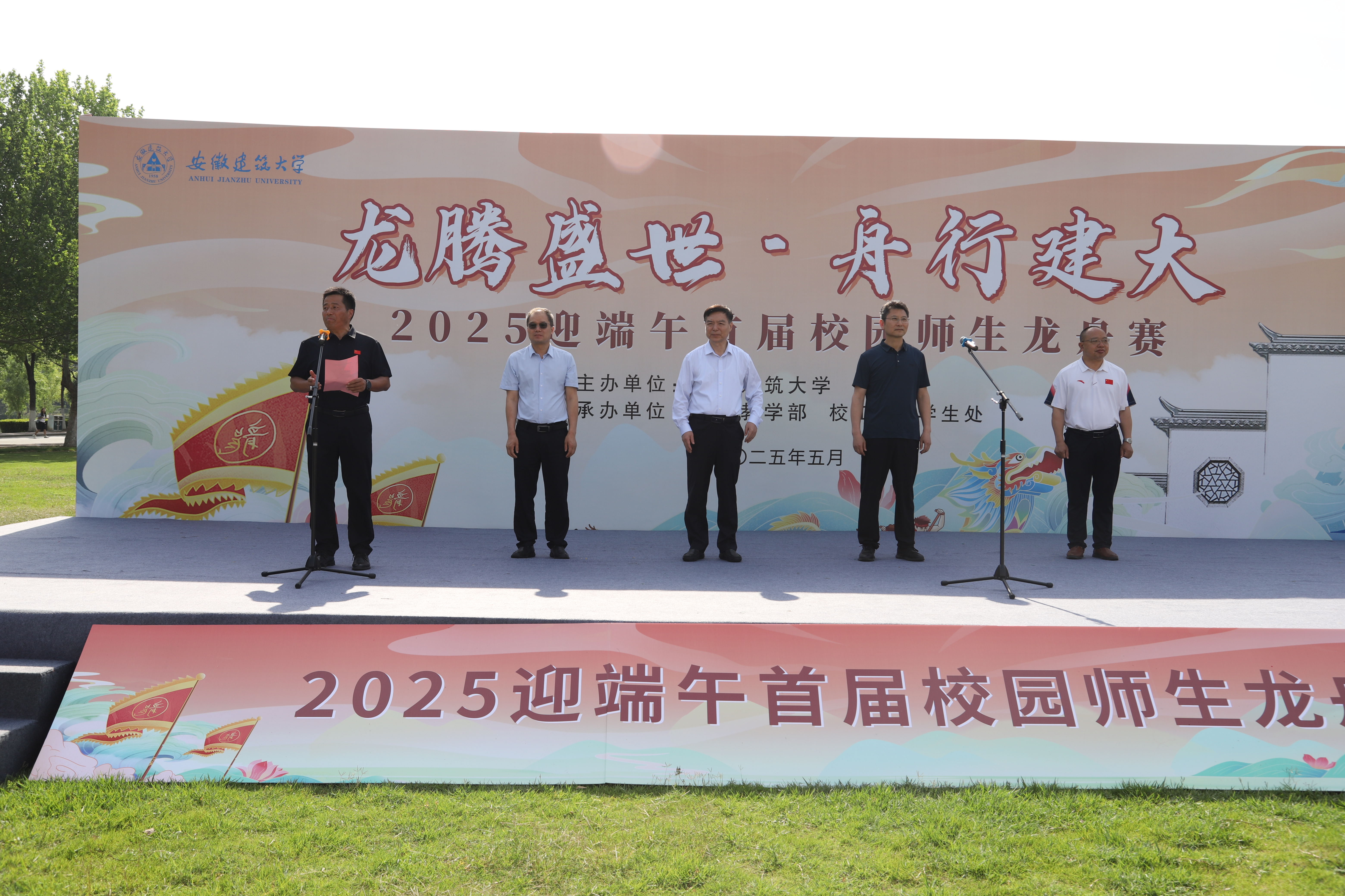 本网讯5月17日上午,紫云路校区易海湖畔鼓声震天、浪花激扬,由体育教学部、校工会、学生处联合承办的“龙腾盛世•舟行建大——2025迎端午首届校园师生龙舟赛”在此顺利举行。校党委书记马文革、校党委副书记、校长黄显怀、校党委常委、副校长李早出席开幕式,安徽省教育厅体卫艺处处长葛德连、安徽职业技术学院党委书记李方泽作为嘉宾应邀出席。