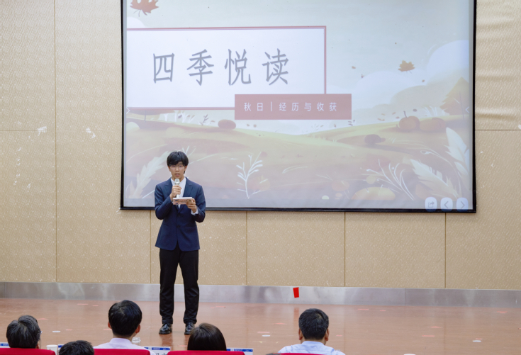 接着,四季主题活动演绎环节启动。在春日篇章中,宁潇琪同学带来经典诗词朗诵,朗朗书声如春日繁花,带领大家领略了古典文学之美,感受了中华文化的博大精深。在夏日篇章,活动介绍了“阅行千里,知行合一”暑期三下乡实践活动及“四季悦读,智享书缘”读书分享会的规划。这些活动通过实践与分享,进一步激发了同学们的阅读兴趣。优秀读书笔记的展示环节中,同学们所获得的深刻思考也得以展现。秋日主题下,马明轩同学分享了其精彩的诗歌创作朗诵,作品《秋日本标馆》捕捉了秋天的斑斓色彩,融入个人情感与思考,展现了对秋天的独特感悟。在冬日的书籍借阅演绎环节中,工作人员与借书学生通过书籍交换的形式,让同学们在寒冬中同样感受到知识传递的温暖,展现了阅读交流的乐趣与重要意义。