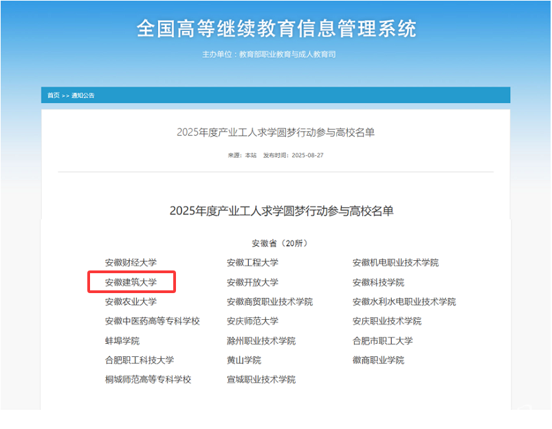 本网讯 近日,教育部公布了2025年度产业工人求学圆梦行动参与高校名单。安徽建筑大学凭借其在服务地方经济发展、深化教育教学改革以及对接产业需求方面的突出成果,成功跻身全国289所入选高校之列。这一重要突破不仅彰显了学校的办学实力,更体现了其在服务国家战略和区域经济发展中的责任担当。安徽省此次共有20所高校入选,入选总数位居全国前三,彰显了安徽省在推进产业工人队伍建设方面的责任担当。