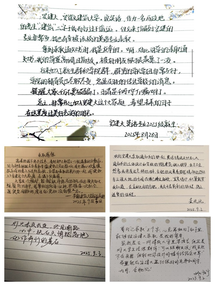 学院向全体2025级新生发起了一场特殊的“文字之约”,邀请大家记录从报考至接收到安徽建筑大学录取通知时的心路历程。新生们踊跃分享,那些质朴的文字里,既有梦想成真的激动,更有对大学生活的无限向往。“看到‘已录取’三个字,心总算放回了肚子里,能够被安建大录取,是我的荣幸。九月,合肥见!”来自2025级英语专业的姚怡宁分享了她的心声。温暖的文字,让新生们在分享中打破隔阂,有人因相似的期待产生共鸣,有人为真诚的表达心生好感,一场未谋面的“初见”在字里行间悄然完成。