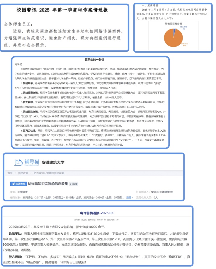 安全是新生开启大学旅程的首要前提,学院秉持着“防患于未然”的理念,为2025级新生筑牢安全屏障。在新生群中,辅导员及时转发“平安安建大”微信公众号防诈防骗相关推文,将“冒充客服退款”“虚假助学贷”等常见诈骗手段一一拆解,为新生擦亮识骗慧眼;利用辅导猫平台,将交通安全的“出行指南”、财产安全的“防护要点”化作一条条暖心提醒,精准推送到每位新生手中;此外,辅导员提前收集新生基本信息,从来校行程安排到当前健康状况等,每一项记录都饱含着对新生的牵挂,为即将到来的校园相聚做好周全准备。