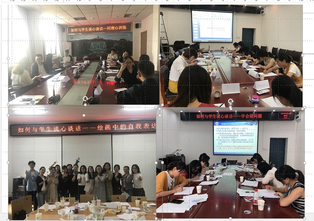 心理中心于2019年全年,开展六期《绘画识人——如何与学生谈心谈话工作坊》,主题分别为《如何与有危机的同学进行筛查访谈》、《同理心训练》、《绘画中的自我表达》、《绘画中的意象表达》、《学会提问题》、《凝练谈话的思路》。工作坊由心理中心高倩老师主讲,水利水电学院研究生辅导员左志香担任协同领导者,共有80人次的辅导员参加此次连续工作坊。
