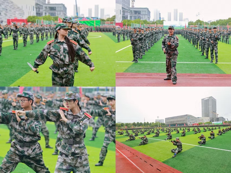 蔡国军一声令下,军训成果展示正式拉开帷幕。首先亮相的是拼字方阵,学员们以精准的跑位、默契的配合,诠释了对祖国的赤诚热爱和对学校精神的领悟;行进间队列方阵表演中,同学们步伐铿锵有力,动作整齐划一,彰显出严格的纪律性和高度的协同精神;战术方阵的演示将现场气氛推向高潮,学员们模拟战场环境,灵活施展战术动作,彰显了过硬的军事素养;刺杀操方阵的同学们口号如雷,突刺凌厉迅猛,动作刚劲有力,尽显一往无前的战斗作风;匕首操方阵的女同学们手持训练匕首,动作干净利落,喊杀声清脆响亮,巾帼不让须眉的英姿成为操场上一道亮丽的风景;格斗术方阵的学员们身手敏捷,展现了扎实的防身自卫能力和勇毅顽强的意志。最后,全体参训学员以一场气势磅礴的大合唱为成果展示画上圆满句号。