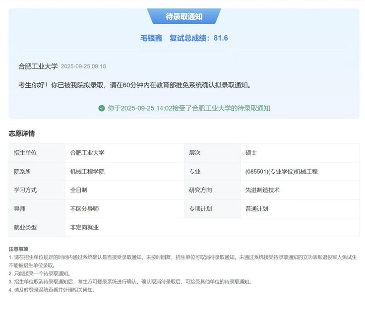 如今,毛银鑫即将步入合肥工业大学,继续深耕机械工程领域。他的保研之路,犹如一场精心规划与耐心打磨的“加工过程”:早定目标、细分规划、扎实积累、主动突破、静心坚持。他始终相信,真正的卓越源于热爱与专注,成于持之以恒的沉稳耕耘。