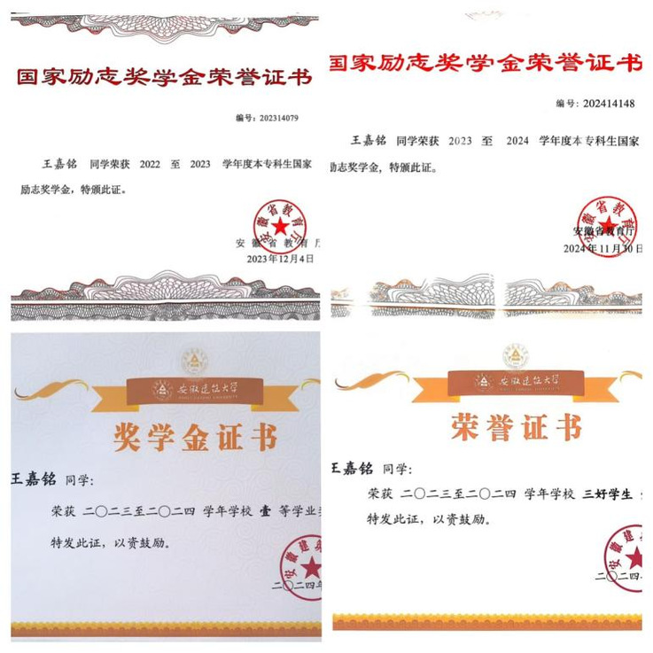 在大学阶段,王嘉铭同学始终秉持奋发努力的态度深耕学业,平均学分绩点3.84,位居专业第一。他善于梳理知识框架,把握学习中的重点、难点、考点。定期复盘学习过程中的知识,坚持做到课前预习、课上专注、课后复习,面对专业课程的重重挑战,他摸索出“预习+复习”的双线学习策略,课堂之上,紧跟老师的授课思路高效汲取知识;课后时间,用系统思维搭建结构化的知识体系,针对流体动力学、机械原理等核心必修课,他不仅结合实验操作深化理论认知,更坚持做好错题复盘,专门整理错题本记录每道题的解题思路与得失要点。凭借高效的学习方法与日复一日的不懈钻研,王嘉铭在学业上收获满满,先后荣获国家励志奖学金、校一等奖学金等多项荣誉。