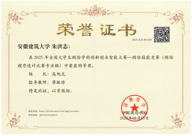 朱洪志,安徽建筑大学2022级测绘工程专业本科生。本科期间,学业成绩始终专业第一,曾获国家奖学金、校级优秀学生标兵等荣誉,并积极参与多项国家级、省级科研与竞赛项目。凭借扎实的专业基础与突出的综合素质,现已成功保研至中国矿业大学(北京)继续攻读测绘科学与技术硕士学位。