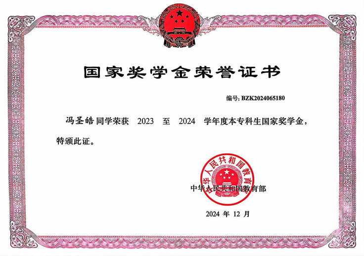 在学习上,冯圣皓始终坚信“功不唐捐,玉汝于成”。课堂上,他始终保持专注,紧跟老师思路,标记重难点,便于课后消化巩固,积极参与小组讨论,将抽象的理论知识与实例相结合;课后,他常去图书馆查阅专业文献,梳理知识框架,遇到疑难问题及时向老师和同学请教,始终秉持“不懂就问”的原则。同时,他能够做到“今日事今日毕”,对于每日所学的知识点,他在完成老师布置的习题进行温习之外,还会找到教科书中相应章节的课后习题来二次巩固,加深记忆与理解,确保彻底掌握。正是由于对专业课的深入钻研,让冯圣皓不仅在课程中取得了优异的成绩,更打下了坚实的专业基础。