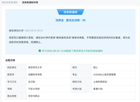 保研的过程并非一帆风顺,从前期反复查阅南京师范大学研究生院官网,精准把握土地资源管理专业的招生要求、考核形式,到精心准备个人陈述、成绩单、获奖证书等申请材料,再到后期等待审核结果的漫长时光,每一个环节都需要足够的耐心和细致。在这个过程中,她也曾因担心跨专业背景不占优势而自我怀疑,但每当看到书桌前摆放的多份奖学金证书,想到自己为目标付出的日日夜夜,便又重新坚定了信念,一步步稳步推进各项准备工作。