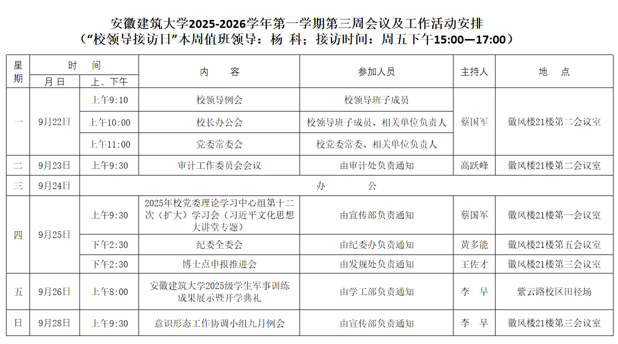 安徽建筑大学2025-2026学年第一学期第三周会议及工作活动安排