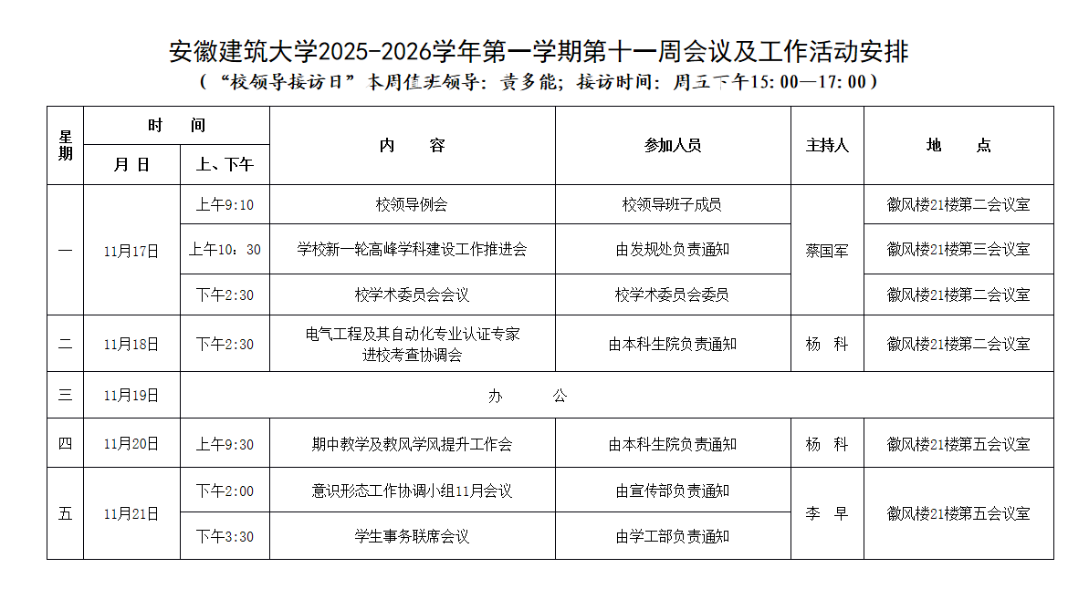 安徽建筑大学2025-2026学年第一学期第十一周会议及工作活动安排