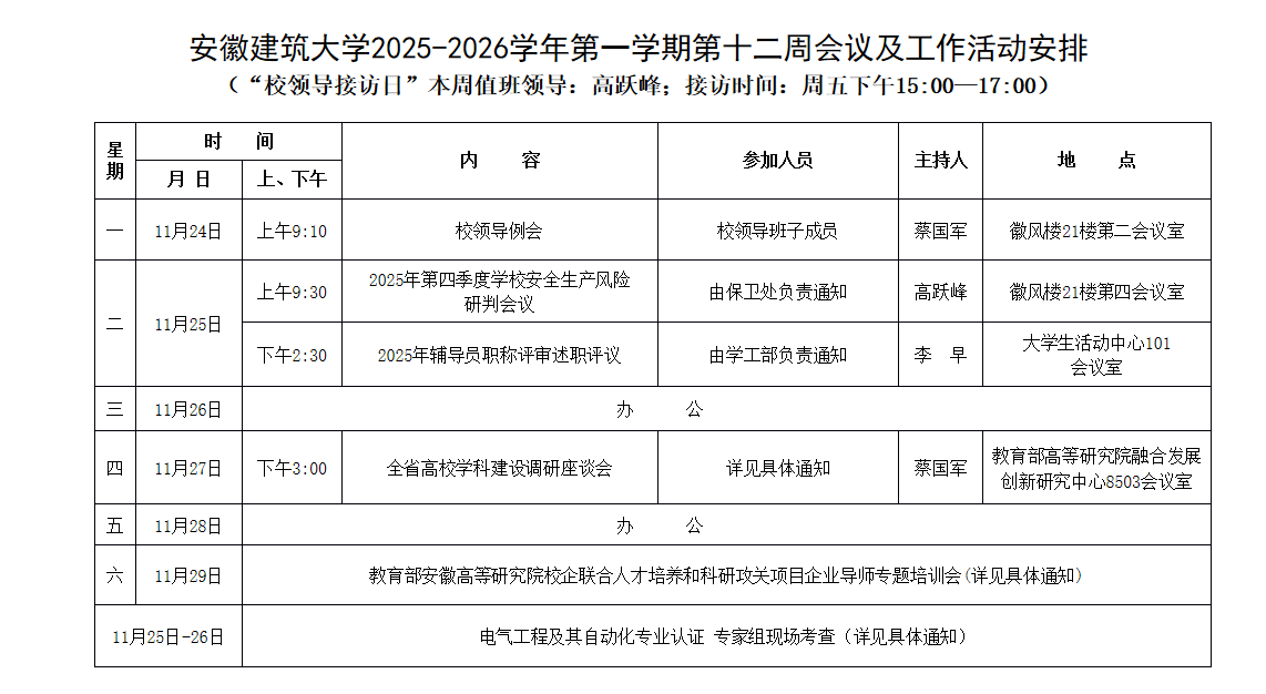 安徽建筑大学2025-2026学年第一学期第十二周会议及工作活动安排