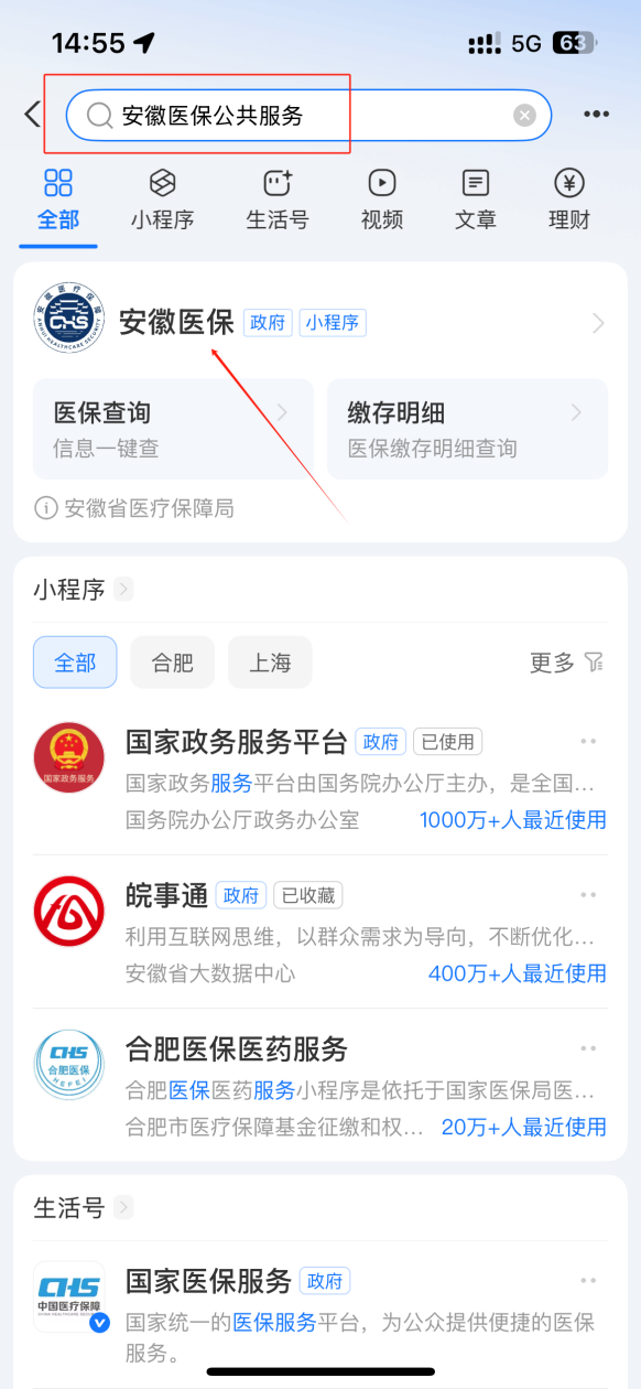 1.微信或支付宝搜索框,搜索小程序:安徽医保公共服务