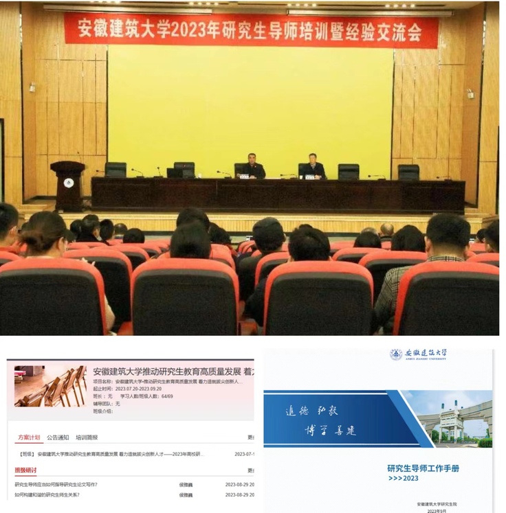 聚焦导师素质,抓好导师队伍建设。“问渠那得清如许,为有源头活水来”,高水平的导师队伍是吸引和培养高质量研究生的“活水源头”。2023年,学校出台《安徽建筑大学研究生教学差错和事故认定与处理办法》,强化人才培养中心地位,依规对导师失德失范行为从严管理,充分展现学校落实立德树人根本要求的态度和决心。通过“一年一遴选,三年一复审”的动态审核机制,新遴选2名校外兼职博导、70名校内硕导、40名校外兼职硕导、92名专业学位硕士生校外导师;122名硕导通过资格复审、188名专业学位硕士研究生校外导师保留硕导资格;择优选聘南信大241名导师担任校外兼职硕导,纳入联合培养导师库。学校推选研究生教学名师、研究生名师工作室等先进个人典型10人和团队典型7个,研究生导师徐文总、赵东林、王爱国入选全球前2%顶尖科学家“年度影响力”榜单。学校已基本建成一支年龄、职称、学缘结构合理,教学、科研、育人能力较强的导师队伍。