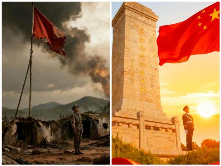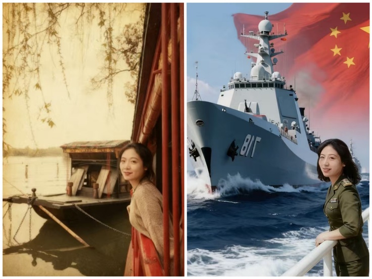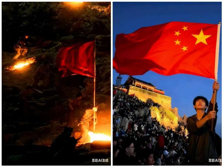 同学作为“红色传承人”,将那段波澜壮阔的峥嵘岁月定格为一张张饱含敬意的“历史瞬间”,尽显表达革命先烈先辈的缅怀与敬意。在AI技术赋能环节,充分发挥专业优势,与同框对比自身日常生活照进行同框对比——一侧是战火纷飞中坚守信念的“往昔身影”,一侧是繁荣时代和平盛世里朝气蓬勃的“今日模样”两张照片的鲜明反差,直观展现了从风雨如晦到国泰民安的时代巨变。