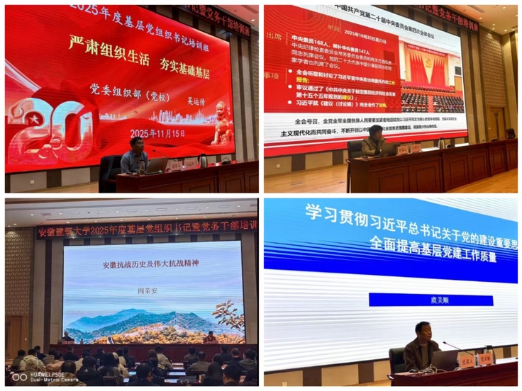 专题教学邀请省委党校、金寨干部学院相关专家授课。《安徽抗战与抗战精神》讲述80年前,在党的领导下,江淮儿女以坚韧和不屈不挠的精神,谱写了一曲威武雄壮的英雄史诗。《习近平总书记关于党的建设的重要思想》向学员们阐述了这一重要思想的科学体系、丰富内涵、实践要求、重大意义。《党的二十届四中全会精神解读》对党务工作者深刻理解和把握党的二十届四中全会核心要义和精神实质、“十五五”规划的深远意义有重要指导作用。校党委常委、组织部(党校)部长吴运传,组织部(党校)副部长、统战部副部长陈泉,电子信息工程学院党委书记张润梅分别结合学校基层党建工作实际,坚持问题导向和目标导向,分别与参训学员分享交流了《严肃组织生活,夯实基础基层》《严格党员发展,规范关系转接》《党建“双创”标杆学院、样板支部培育创建》等基础党务课程。